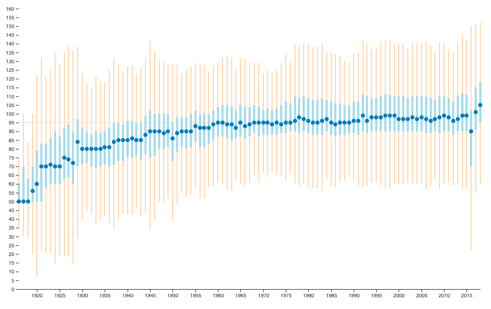 I used Wikidata’s online query service to export all movies then filtered those with both a publication date and a duration. This gave me a large JSON which I processed using Python in order to extract a couple numbers for each year: min, max, median, first and third quartiles.